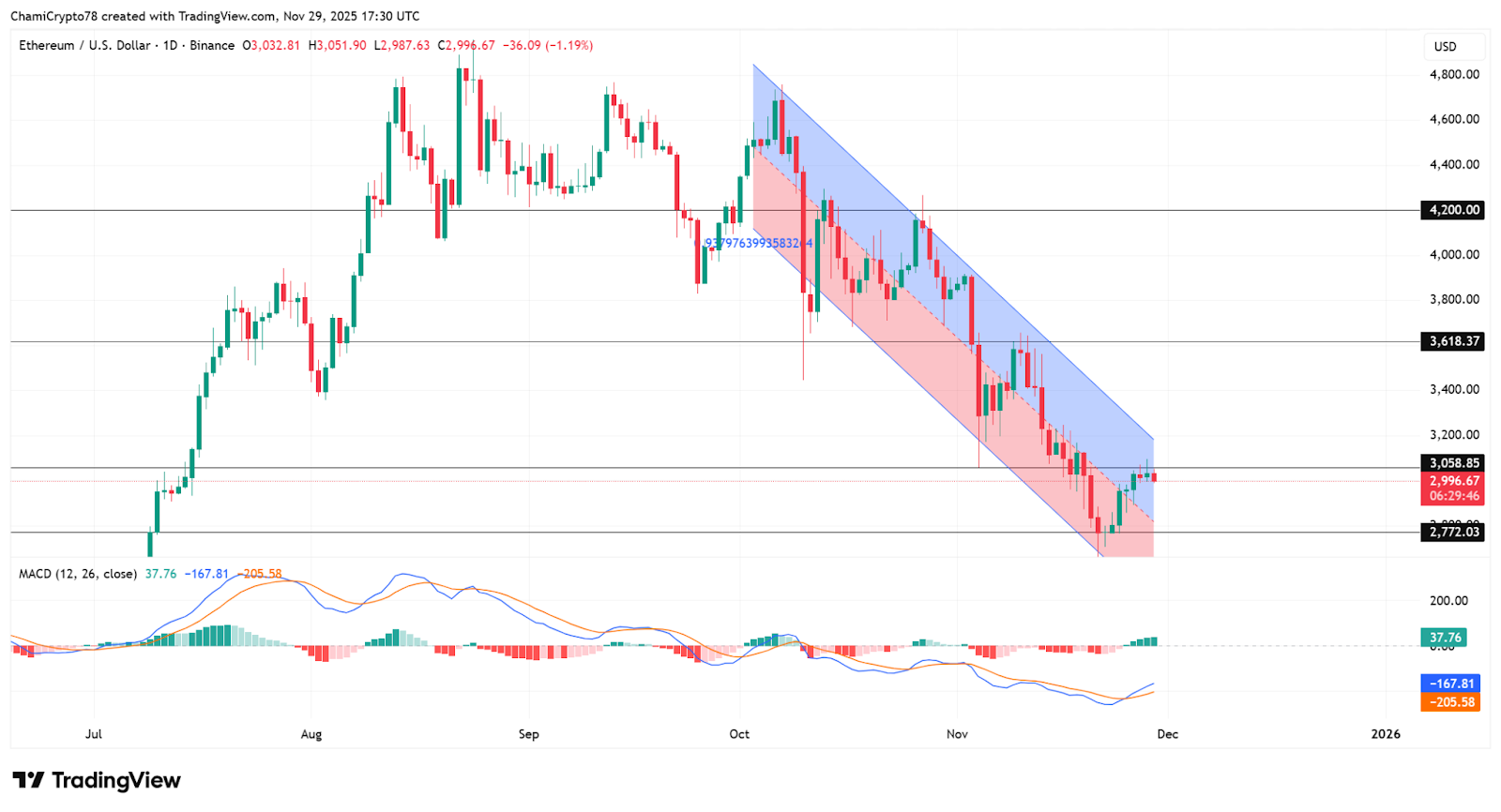 هذا الخطأ ملحوظ بشكل خاص على مخطط إيثريوم لشهر نوفمبر 2025: كان السعر يتحرك داخل قناة هابطة، وكان معظم المتداولين الأفراد يحاولون ”الاستفادة من الانعكاس“ دون تأكيد. يوضح الإطار الزمني اليومي كيف أن اختراق القناة كان مصحوبًا بحجم تداول ضعيف ومؤشر MACD سلبي، مما يشير إلى استمرار الانخفاض. أدى تجاهل هذه الإشارات إلى الدخول في صفقات خاسرة، خاصة عند محاولة التداول كما لو أن الاتجاه قد بدأ، في حين أن السوق كان في مرحلة التوزيع.