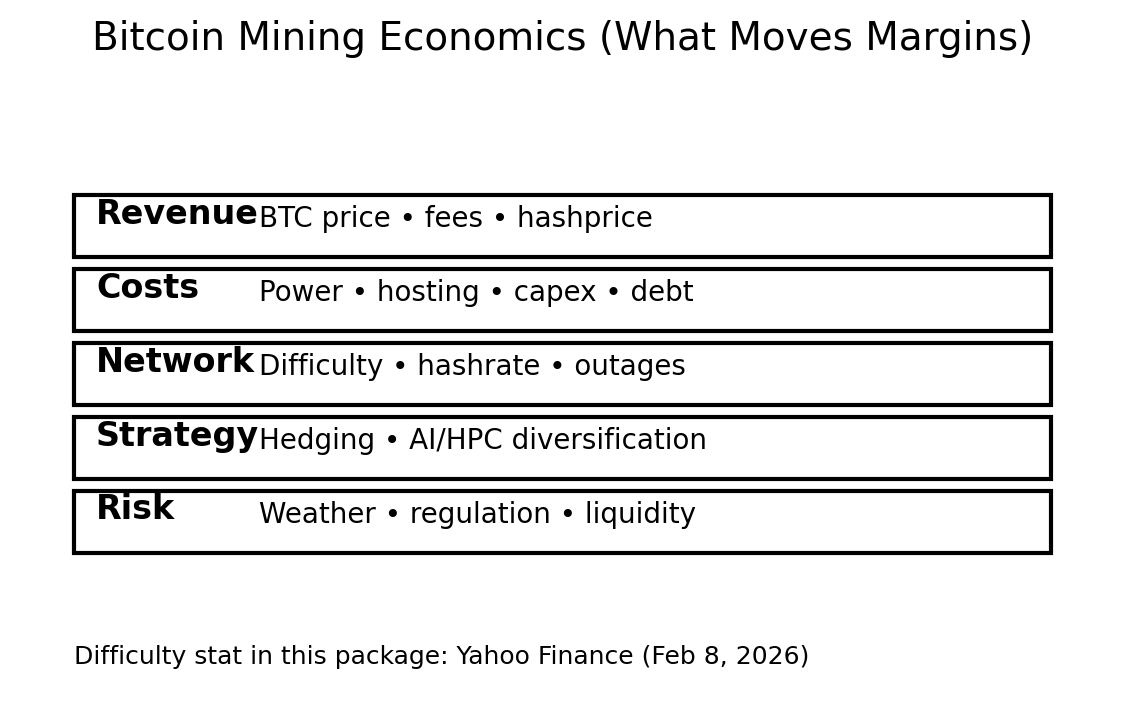 Track difficulty, hashprice, and power-market conditions. If difficulty rises while BTC price is flat, margins compress. If difficulty falls or power costs drop, margins improve. Also watch public miner updates on curtailment, financing, and moves toward AI/HPC hosting — those decisions often reveal how executives see the next cycle.