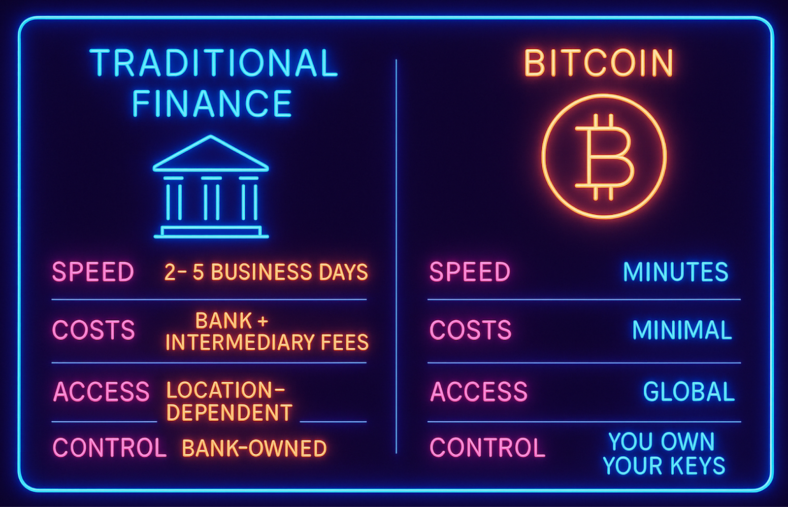 Still, here’s the thing: the old money system moves at snail speed, with hidden fees and middlemen at every step. Bitcoin moves at internet speed — global, open, and in your control. You hold the keys, you make the rules.