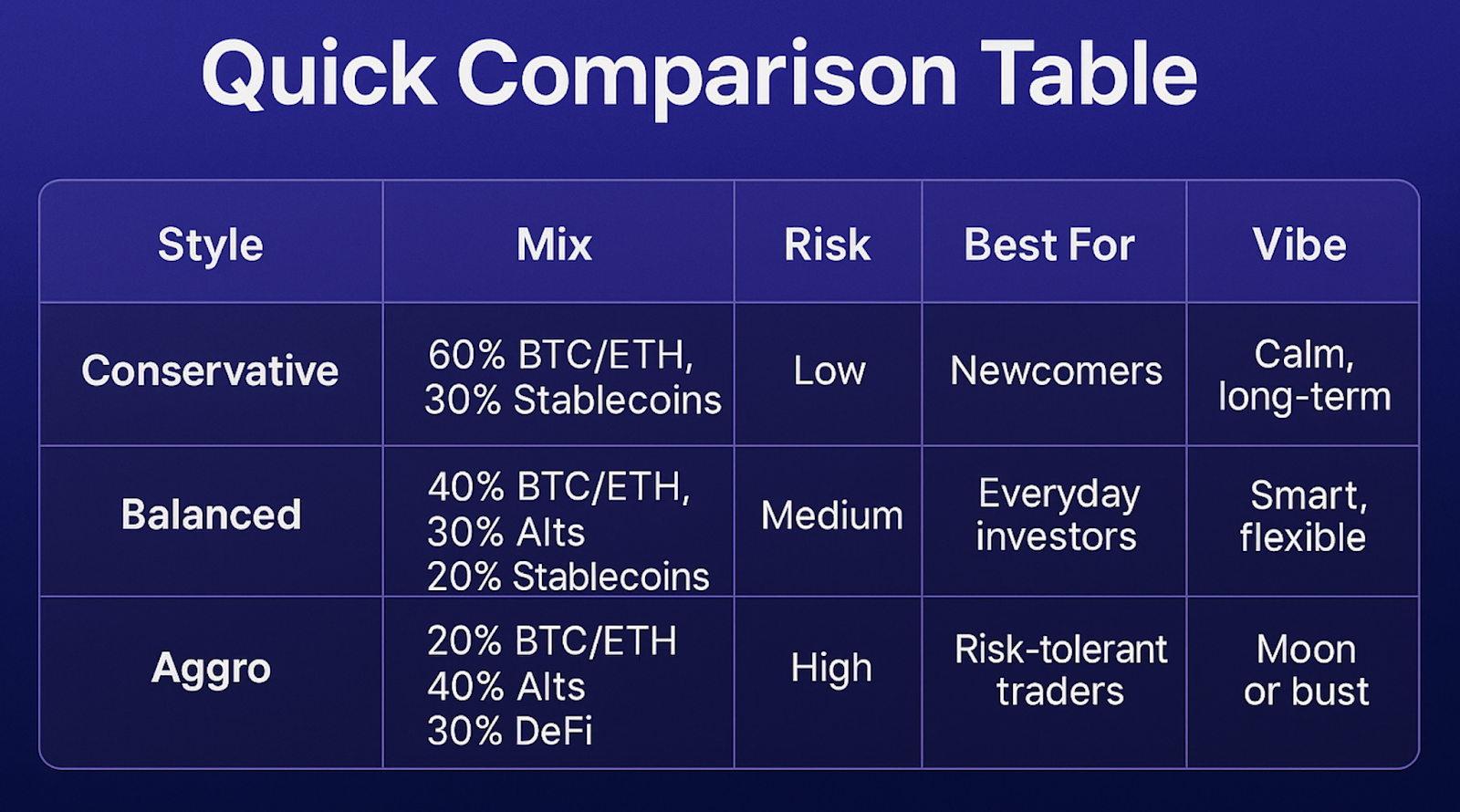 - Mix Bitcoin, Ethereum, stablecoins, and a few high-conviction altcoins to balance risk and upside.