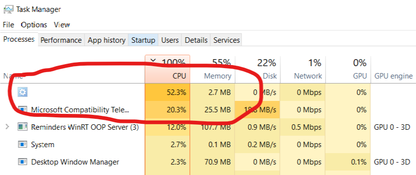 If you see that the processor is loaded at 50-80-100% for no apparent reason, this is cause for concern. Usually, process you’re looking for can have either a weird name (or none at all), or disguise itself as legitimate process, such as Isass.exe, one of numerous svchost.exe instances or cmd.exe.