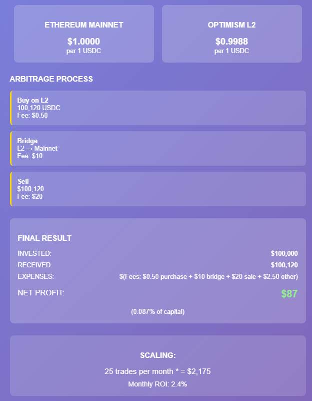 Exemplo real da prática: em agosto de 2024, o preço do USDC na Optimism era 0,12% mais baixo do que na mainnet (1 USDC = $0,9988 contra $1,0000). Com um faturamento diário de $100.000, o lucro líquido após as taxas foi de $87. ROI mensal em condições favoráveis: 2–4%.