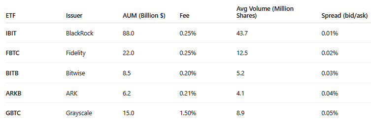 - ARK ARKB, Bitwise BITB, VanEck HODL — players menores e de nicho com taxas competitivas.