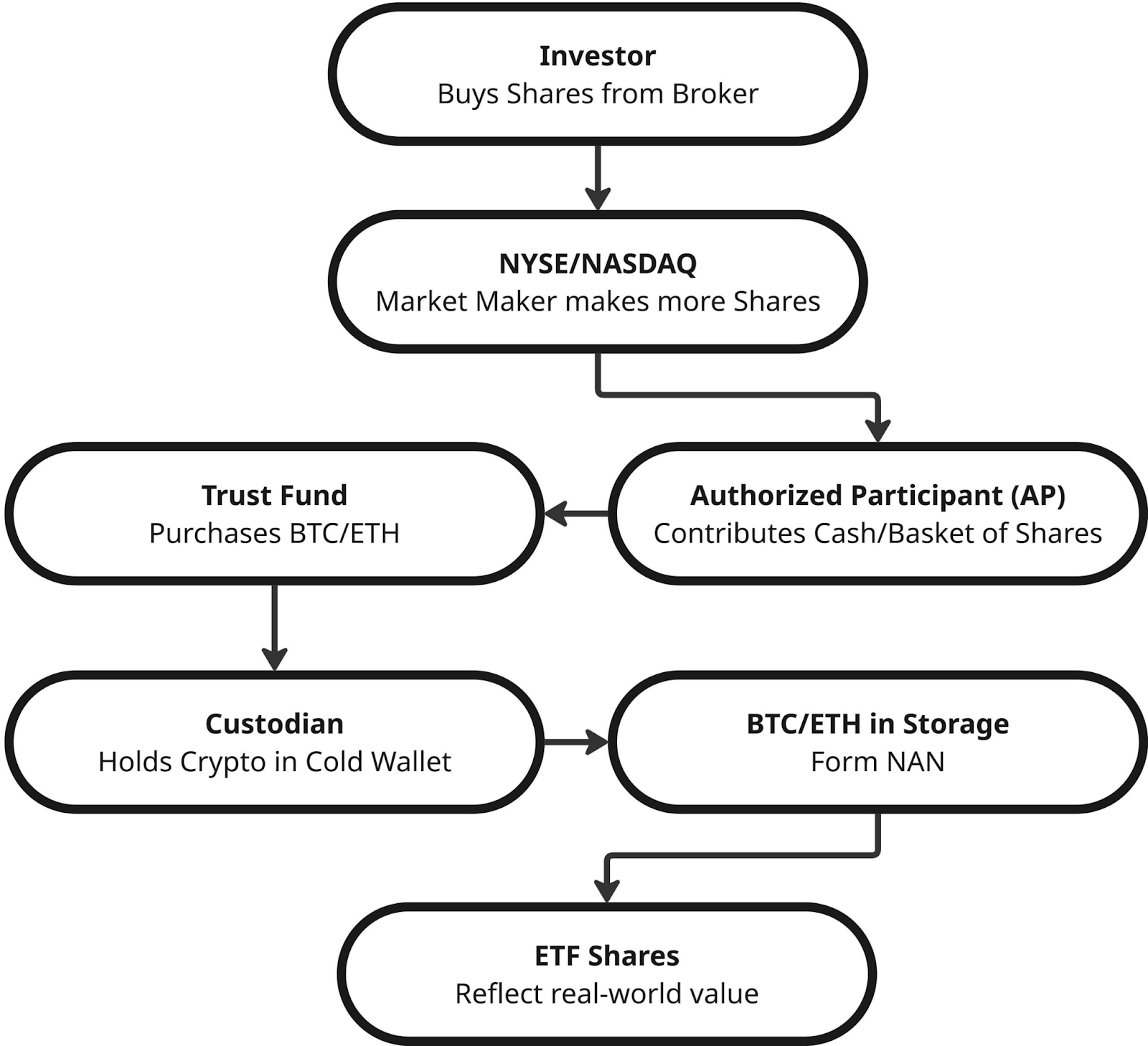 Enquanto isso, nos bastidores, os adultos — participantes autorizados — trocam ações do ETF por BTC ou ETH reais e vice-versa, mantendo o preço próximo ao seu NAV (valor patrimonial líquido).