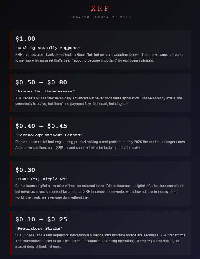 Então, a Ripple se tornará uma consultora de infraestrutura, em vez de uma camada de liquidação. O XRP não morre, mas deixa de ser essencial — o preço se aproxima da faixa inferior de sua previsão.