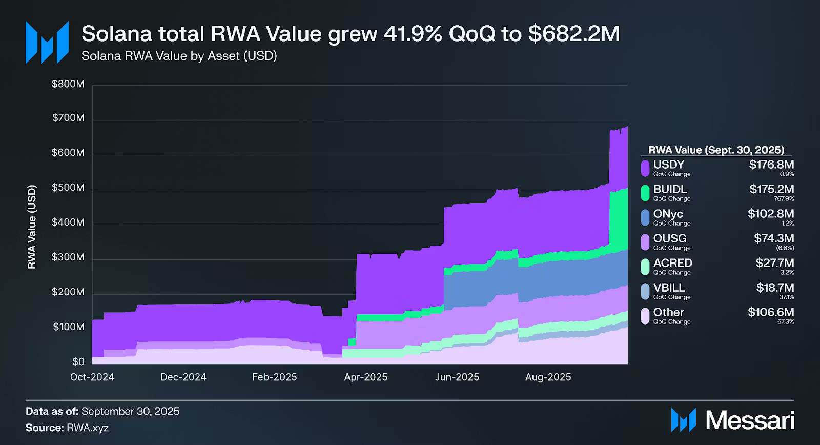 Principal impulsionador: projetos envolvendo stablecoins com rendimento e ativos reais (Ondo USDY, Parcl, Securitize), armazenamento de renda institucional.