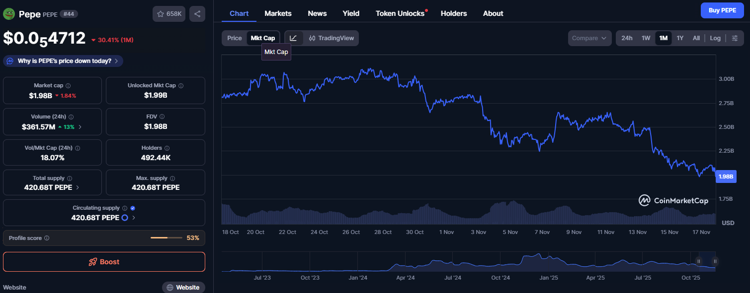 “Lançado originalmente como um projeto de brincadeira, o PEPE se tornou um participante notável no mercado de memecoins.” — CoinCodeCap