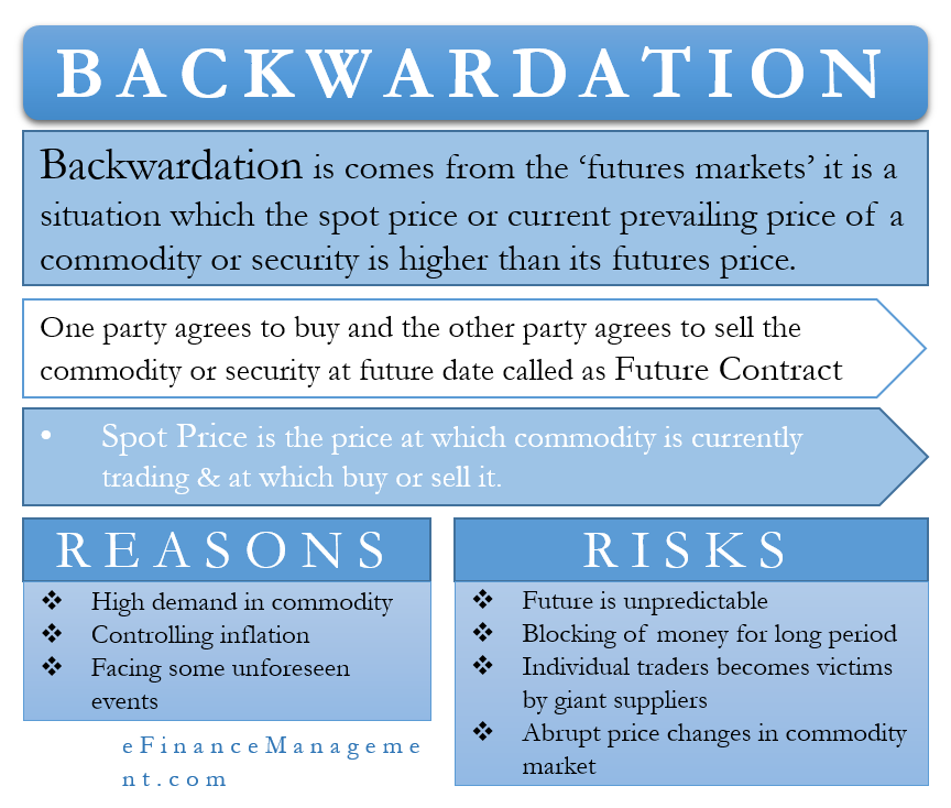 Backwardation is when futures are cheaper than the expected spot price at the time of execution. This affects the strategies of different market participants.