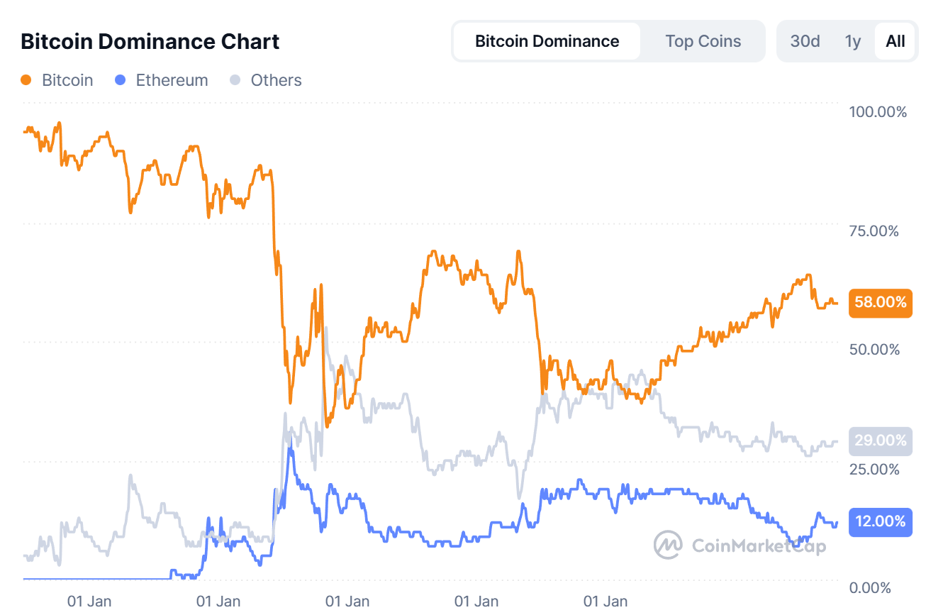 Source: Coinmarketcap.com3. Bitcoin Dominance Index. Shows the market share of Bitcoin compared to other cryptocurrencies. A decline in this indicator is often seen as a sign of the approaching altseason — a period of active growth in altcoin prices.