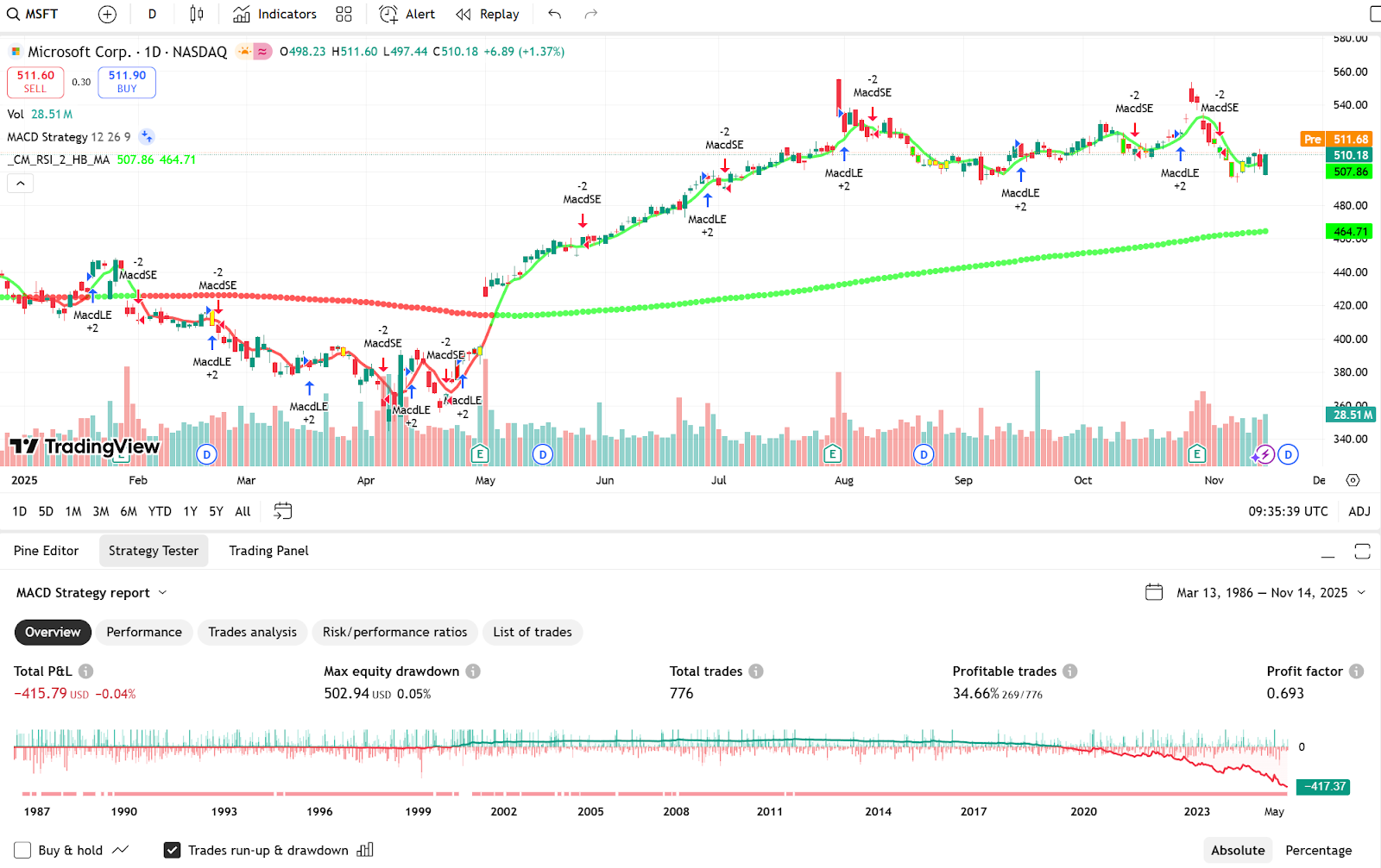Microsoft Corporation (MSFT) stock performance, taking into account volume indicators, MACD, and RSI
