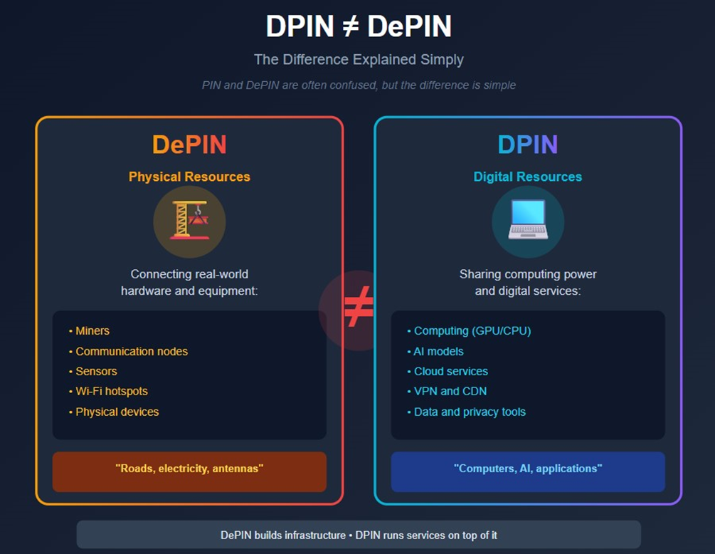 Bei DePIN geht es um physische Infrastruktur, bei DPIN um darauf aufbauende digitale Dienste (Rechenleistung/KI/VPN/Speicher).