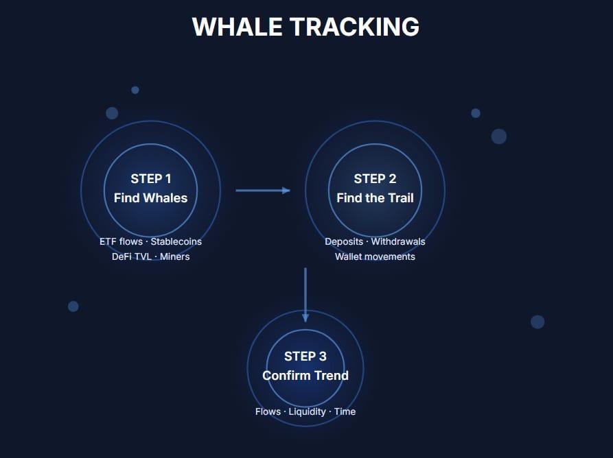 Bitcoin-ETF-Ströme, Stablecoin-Verteilung, DeFi-Liquidität und wichtige Wallet-Bewegungen. Diese zeigen, wohin das Kapital fließt.