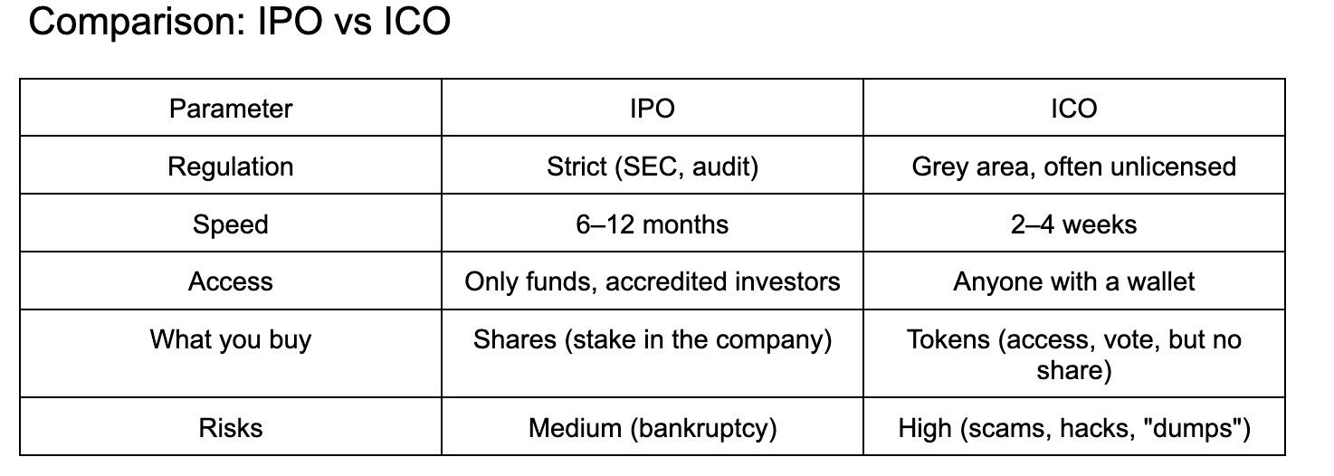 Ein Börsengang ist schwer zu fälschen: Er erfordert Wirtschaftsprüfung, Registrierung, Banken und eine Börse. Ein gefälschter ICO hingegen kann in 10 Minuten gestartet werden. Daher ist es wichtig zu verstehen, was Sie kaufen: eine Beteiligung an einem Unternehmen oder einen digitalen Vermögenswert mit eingeschränkter Funktionalität.