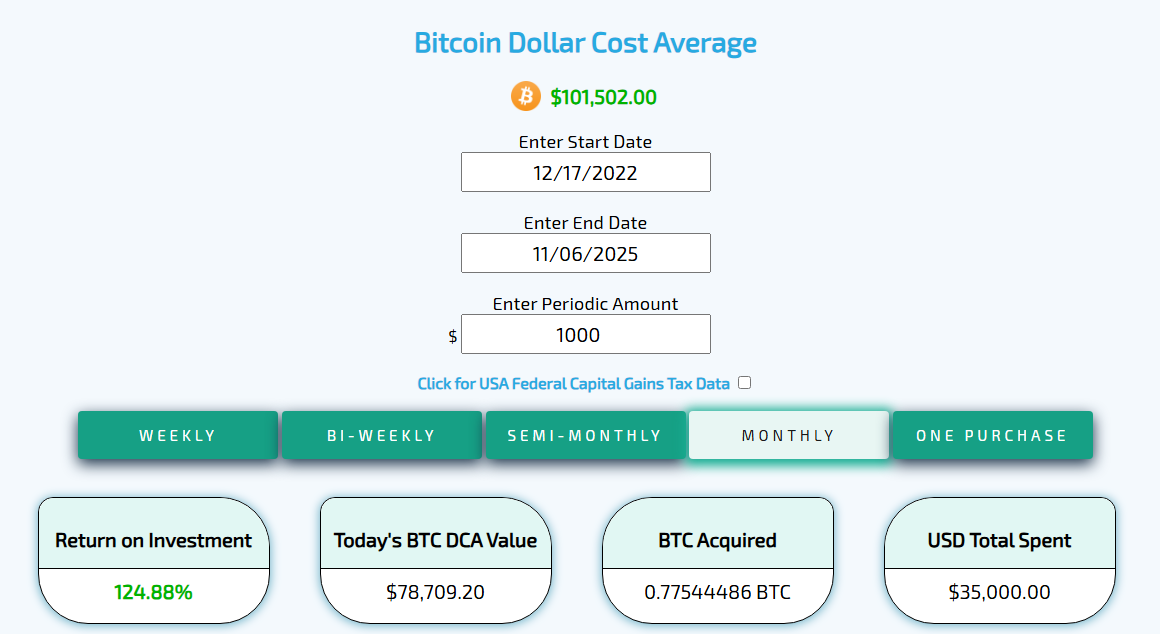- Einmalige Zahlung. Wenn Sie davon überzeugt sind, dass wir uns am Tiefpunkt eines Bärenmarktes befinden (z. B. BTC −80 % gegenüber ATH), kann ein einmaliger Kauf eine Outperformance erzielen – dies erfordert jedoch Überzeugung und Analyse.