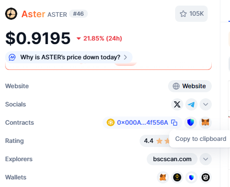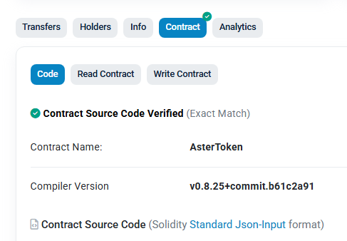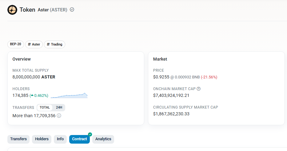 Ejemplo de página de contrato de token:Aster (ASTER) | BEP-20 | Address: 0x000Ae314...2734f556A | BscScan