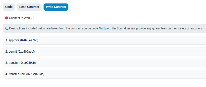 Aquí aparecen las funciones que modifican datos en la cadena, por lo que requieren ejecutar una transacción (como transferencias o quema de tokens).