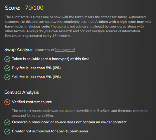 ✔ El contrato está verificado ✔ El propietario no tiene control excesivo ✔ Las comisiones no pueden modificarse a niveles extremos ✔ El token no es un honeypot ✔ La liquidez no puede retirarse instantáneamente