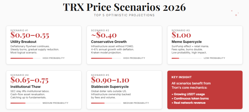 Los escenarios negativos siguen siendo posibles. La presión regulatoria sobre Tether o la pérdida de ventaja en costes podrían empujar a TRX de nuevo hacia 0,15–0,20 $. No sería el fin de Tron, sino una valoración más baja que reflejaría un mayor riesgo.La conclusión clave es sencilla: todos los escenarios giran en torno al uso real de la red. Tron no funciona a base de expectativas. Funciona a base de transacciones.