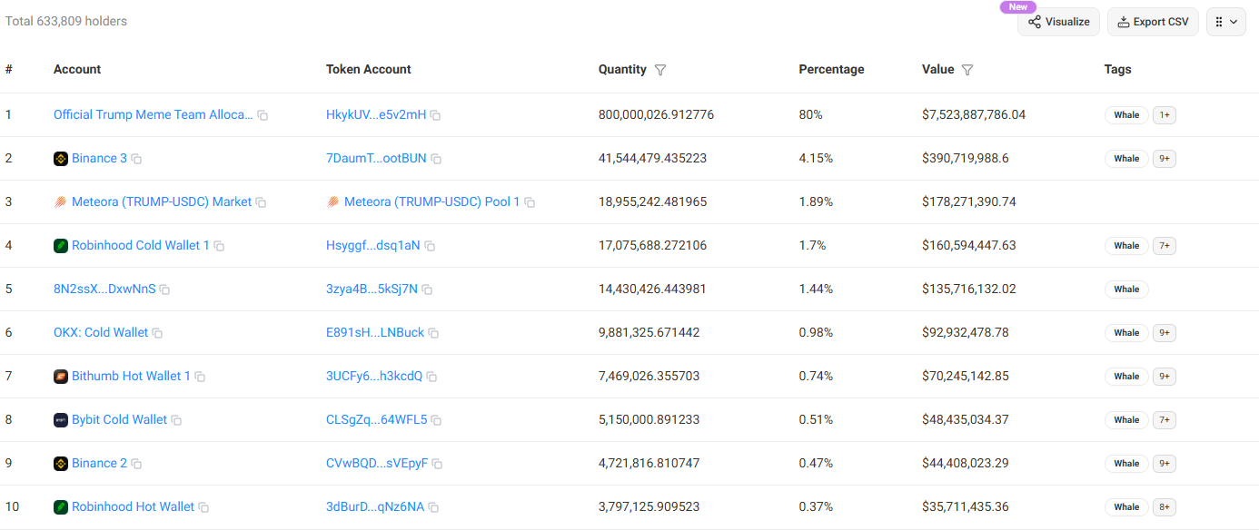 En el verano de 2025, Justin Sun anunció su intención de comprar otros $100 millones en TRUMP, duplicando su posición conocida en ese momento; al mismo tiempo, la capitalización de mercado del token cayó bruscamente desde su máximo hasta alrededor de $2 mil millones en julio, lo que puso de manifiesto la dependencia del precio respecto a los grandes tenedores.