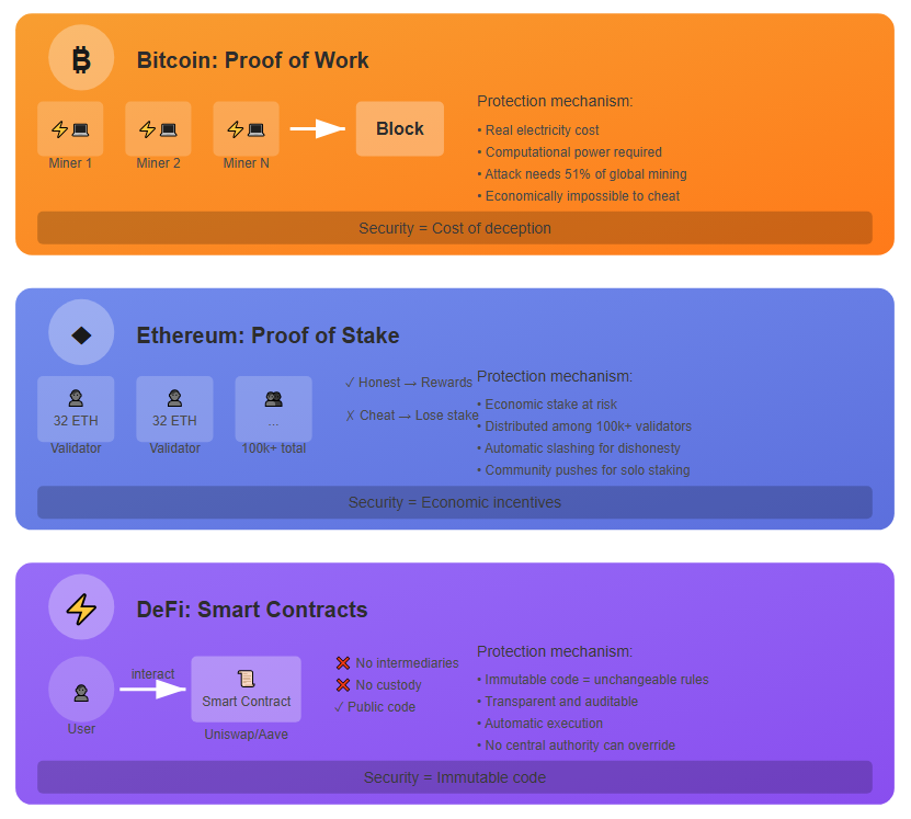 Les réseaux blockchain fonctionnent différemment. Au lieu d'un serveur central, il existe un réseau distribué de nœuds, chacun détenant une copie complète de toutes les transactions et vérifiant les nouvelles. Pour modifier des enregistrements ou voler des fonds, un attaquant devrait contrôler la majorité des nœuds, ce qui est économiquement irréalisable lorsque le réseau est suffisamment décentralisé.