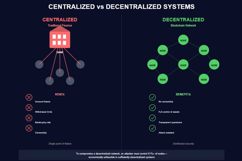 La décentralisation consiste à répartir le contrôle d'un système entre plusieurs participants indépendants, plutôt que de le confier à une seule organisation, afin de se protéger contre la censure et la confiscation d'actifs.