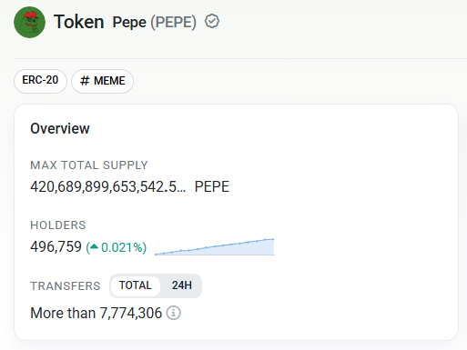 L'offre totale de PEPE est de 420,69 billions de tokens, un chiffre qui fait référence à la culture meme et à la blague « 420 ». Au départ, 93,1 % des jetons ont été envoyés vers un pool de liquidités sur Uniswap, tandis que les 6,9 % restants ont été placés dans un portefeuille multisig en vue d'une future cotation sur des bourses centralisées et d'une expansion de la liquidité.