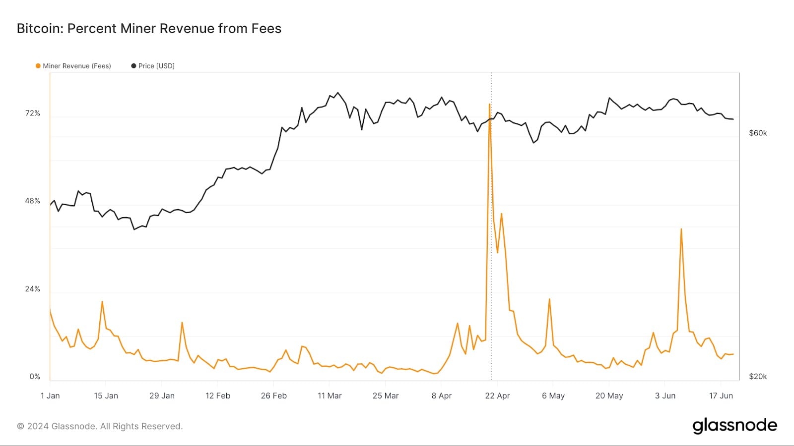 - Quota delle commissioni di transazione nelle entrate dei miner: i picchi non sono una nuova norma