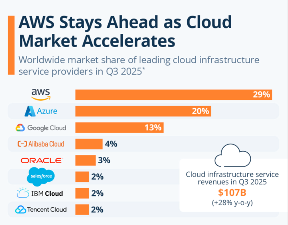 AIモデルには膨大なクラウド処理能力が必要だ。現在、市場の62%を3社(AWS、Azure、Google Cloud)が独占している(Statista調べ)。