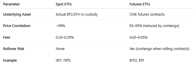 現物型ETFは原資産を直接所有するシンプルな形態。先物型ETFは合成商品であり、隠れたロールコスト、高いボラティリティ、場合によってはトラッキングエラーを伴う。