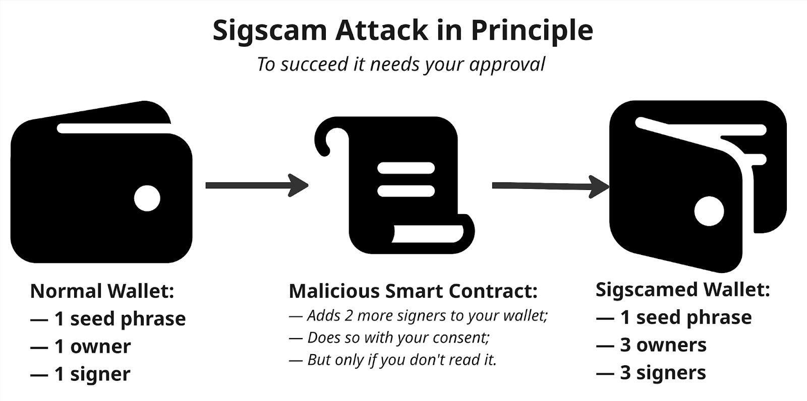 マルチシグには落とし穴がある — 暗号資産を支出するにはアドレスの過半数の署名が必要となる。したがって、これは同時に攻撃ベクトルでもあります。原理は単純です——あるウォレットに署名権限としてさらに2つのウォレットを追加すれば、実質的に「ハッキング」された状態になるのです。