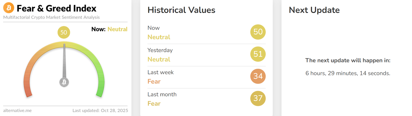 この結果に基づき、市場センチメントは「恐怖」と分類されます。本指数の論理によれば、これは資産購入の好機を示唆する可能性がある。