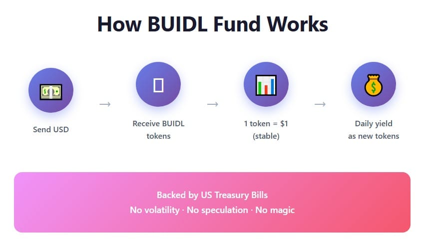 ํฌ์์๊ฐ ๋ฏธ๊ตญ ๋ฌ๋ฌ๋ฅผ ์ก๊ธํ๋ฉด โ Securitize๊ฐ BUIDL ํ ํฐ์ ๋ฐํํฉ๋๋ค โ ๊ฐ ํ ํฐ์ 1๋ฌ๋ฌ์ ์์ ์ ์ผ๋ก ํ๊ทธ๋ฉ๋๋ค โ ์์ต์ ๋งค์ผ ์๋ก์ด ํ ํฐ ํํ๋ก ์ง๊ฐ์ ์ง์ ์ ๋ฆฝ๋ฉ๋๋ค.