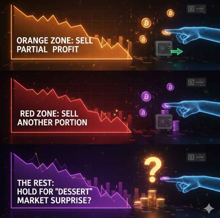 레인보우 차트는 부드럽고 심리적으로 편안한 방법을 제안합니다: “전부 팔기” 대신, 시장이 달아오를 때 부분적으로 매도하세요.