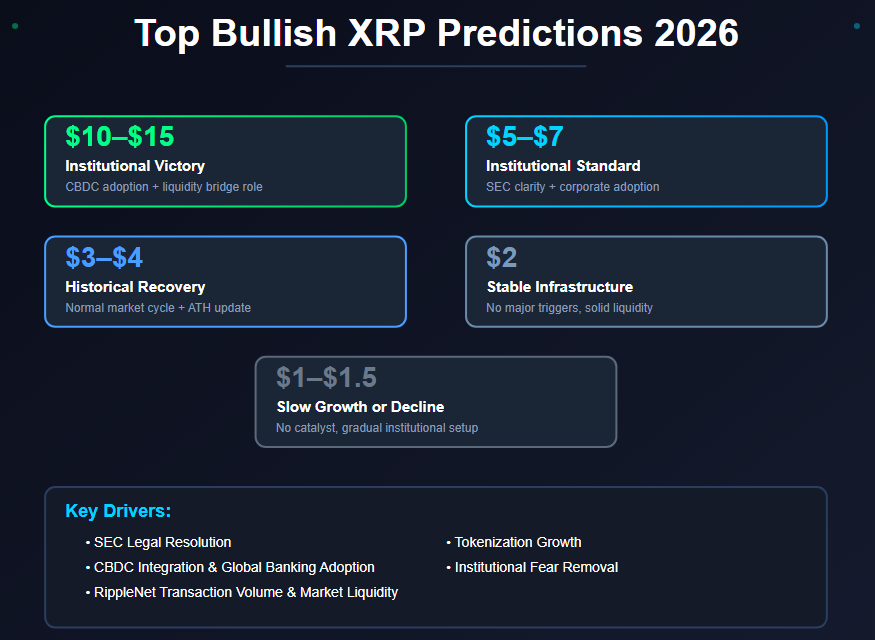 리플에 대한 현실적인 시나리오 범위입니다 — XRP가 글로벌 유동성 레이어가 되는 경우부터 규제나 경쟁으로 기술이 관련성을 잃는 경우까지 포함됩니다.
