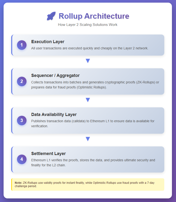 간단히 말해, 이더리움(L1)은 전체 네트워크의 기반 — 메인 도로입니다. 규칙이 존재하고, 보안이 유지되며, 모든 거래에 대한 최종 진실이 저장되는 곳입니다. 하지만 이 '도로'는 무한히 탄력적이지 않습니다. 사용자가 늘어날수록 교통은 느려지고, 수수료는 치솟으며, L1을 직접 확장하는 것은 탈중앙화에 위험해집니다.