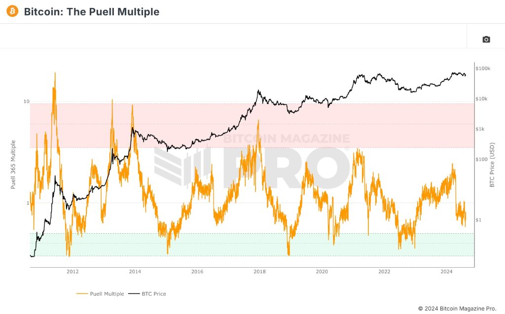 Индикатор Puell Multiple сравнивает текущий дневной доход майнеров с его 365-дневной MA. Значение ниже 0.5 — исторически лучшие точки входа, выше 4 — перегрев.