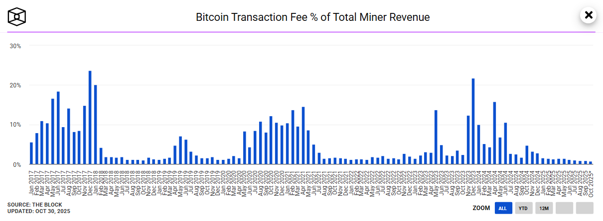 В 2023 году они составляли 10–15 % дохода, а в 2024 году — уже до 40 % в периоды перегрузки сети (всплески активности Ordinals, токенов BRC-20 и микротранзакций):