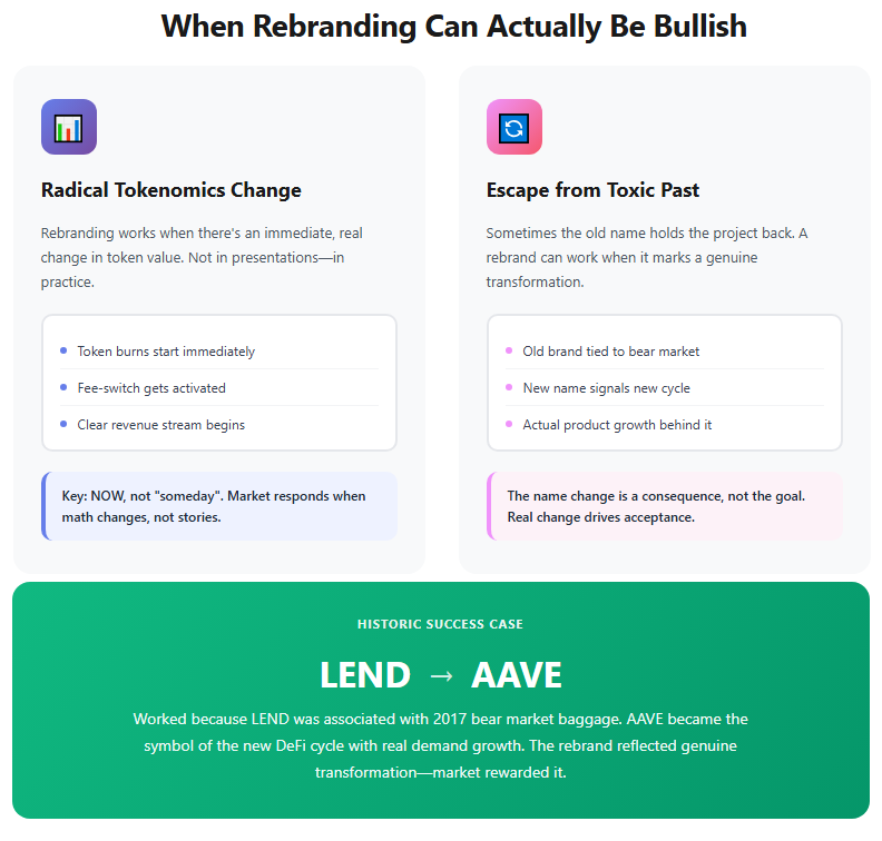 Многие до сих пор вспоминают историю LEND → AAVE как доказательство того, что ребрендинг может “перезапустить” проект. И это правда — тогда. Но рынок 2021 года и рынок 2025 года — это два разных организма.