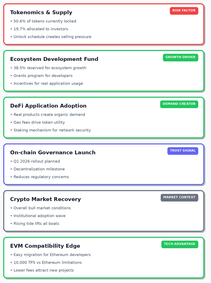 В таком случае рост цены обеспечивается постепенным увеличением активности в сети, появлением новых приложений и общим восстановлением крипторынка в 2025–2026 годах. Это не «история успеха десятилетия», но вполне достойный результат для нового блокчейна.