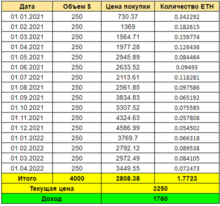 На одном из сайтов нашли реальный пример DCA-инвестиций в Ethereum. С 1 января 2021 года инвестор ежемесячно вкладывал по $250. В итоге, через 16 месяцев его прибыль составила примерно $1 760 в долларовом эквиваленте:
