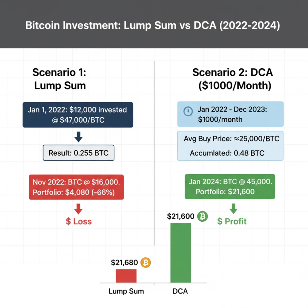 Lump Sum (единовременная покупка). Если у вас есть крупная сумма и вы уверены, что рынок на дне медвежьего цикла (например, Bitcoin упал на 80% от ATH), lump sum может дать больше прибыли. Но это требует смелости и аналитических навыков.